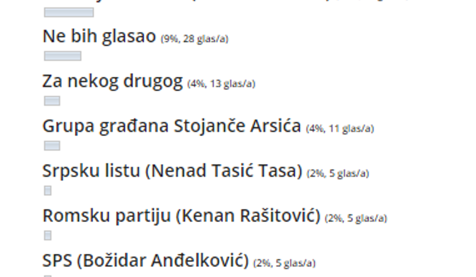 - Za grupu građana oko aktuelnog zamenika predsednika opštine Stojanče Arsića glasalo je 11 naših čitalaca, odnosno 4 odsto, dok po 2 odsto, odnosno po 5 glasova imaju Romi, SPS i Srpska lista, koji participiraju u aktuelnoj vlasti.