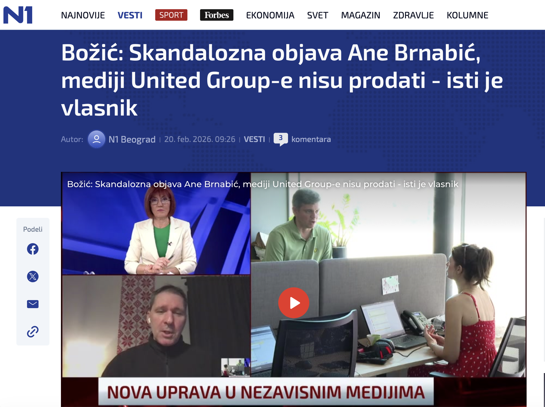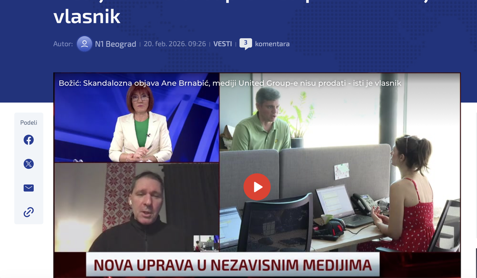 Podsetimo, United Group je saopštila u četvrtak da uvodi novi sistem korporativnog upravljanja za svoje informativne programe, čime, kako ističe, potvrđuje posvećenost očuvanju uređivačke nezavisnosti i zaštiti novinarskih sloboda.