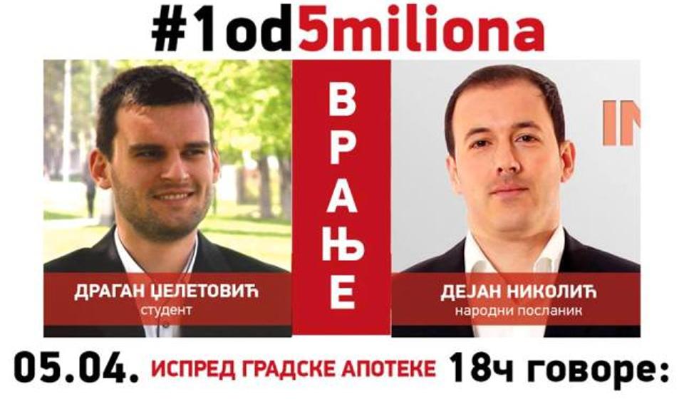 Dragan Dželetović i Dejan Nikolić govoriće u petak 5. aprila na jedanaestom protestu "1 od 5 miliona" u Vranju, najavljeno je iz Građanske inicijative.