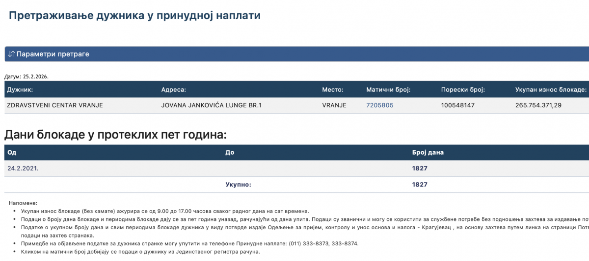 Blokada računa ZC Vranje neprekidno traje od 11. maja 2016. godine.