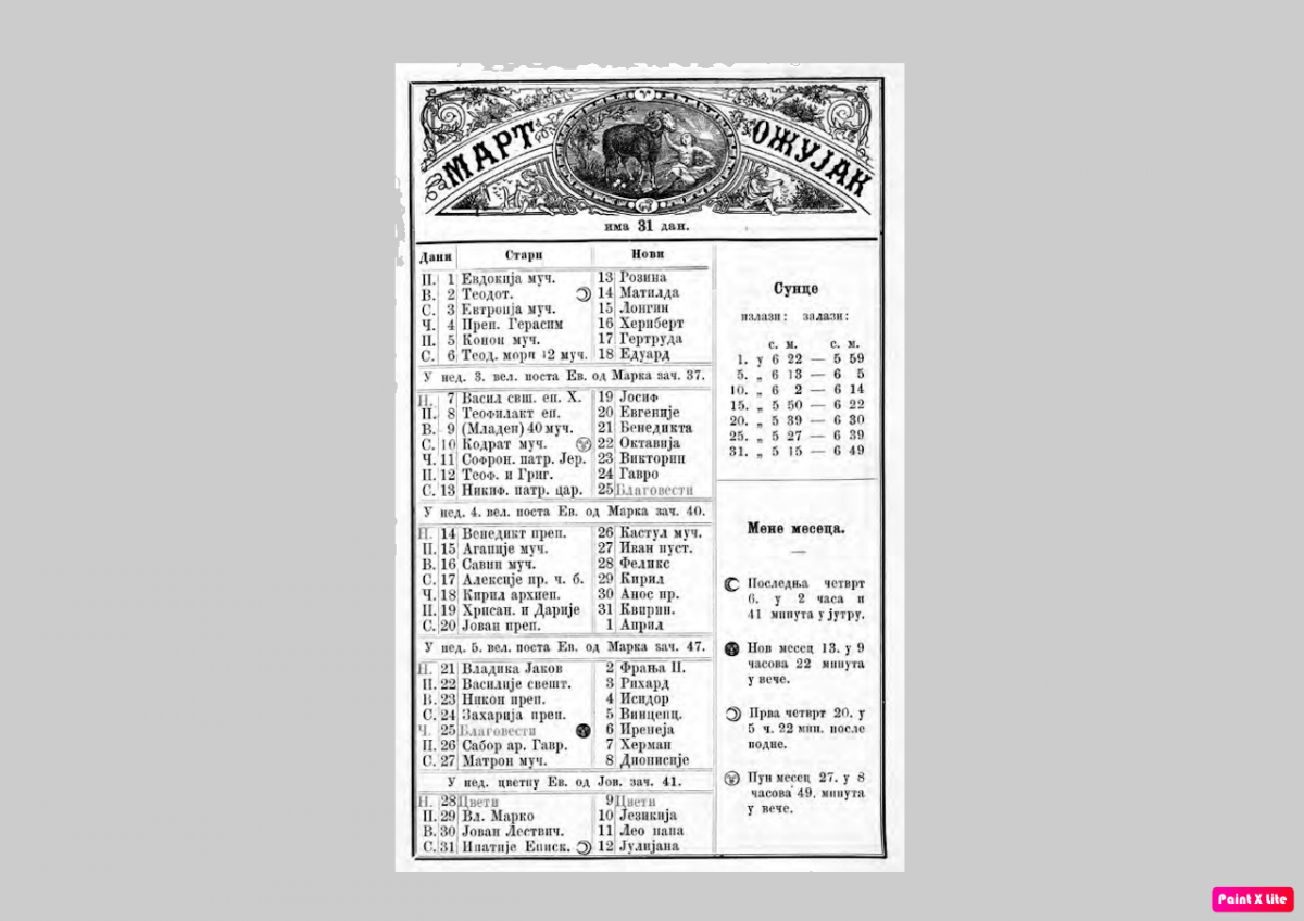 „Jedan mu je rođak, po tim podacima doneo na hartiji paskvalni račun, izračunat dan i mesec, overen računom i g. Milanovića, profesora Univerziteta, ali je Stanković tu belešku negde zaturio i izgubio. Da se ne bi ponovo mučili računanjem, potražio je naš saradnik u Narodnoj biblioteci, sada već potpuno sređenoj, kalendar „Orao“ za 1876. godinu. Tu se uverio da je te godine Uskrs bio 4. aprila, a prva nedelja posta (pačista) počinjala je 22. februara, druga (bezimena), 29. februara, a treća (siropusna nedelja, znači nedelja kada se prestaje sa upotrebom sira i mlečnih proizvoda kao početak potpunog posta)) padala je 7. marta. U toj trećoj nedelji sreda je bila tačno 10. marta (mart se u to vreme zvao ožujak i vetreni) na dan mučenika Kodrata i Kiprijana.
