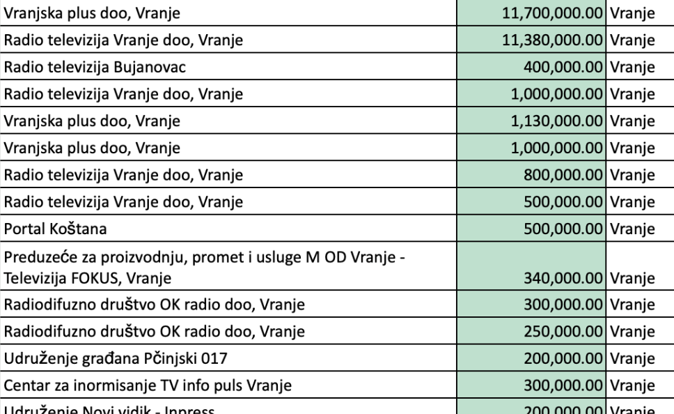 Projektu portala Koštana, za koji u Vranju retko da je ko i čuo, odobreno je 500.000 dinara, Televiziji Fokus 340.000 dinara, OK radiju za dva projekta ukupno 550.000 dinara, TV Info puls 300.000, Portalu Pčinjski-017 iz Bujanovca 200.000 i portalu Inpress 200.000 dinara.
