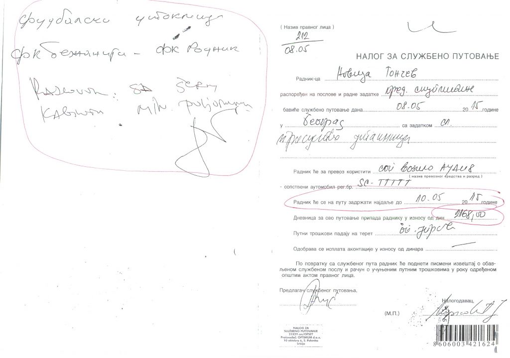 Kao zadatak u putnom nalogu stoji „prva utakmica u Jelen super ligi“, a kao aneks ispisan olovkom „sastanak sa Karadžićem u vezi reflektora na stadionu“.