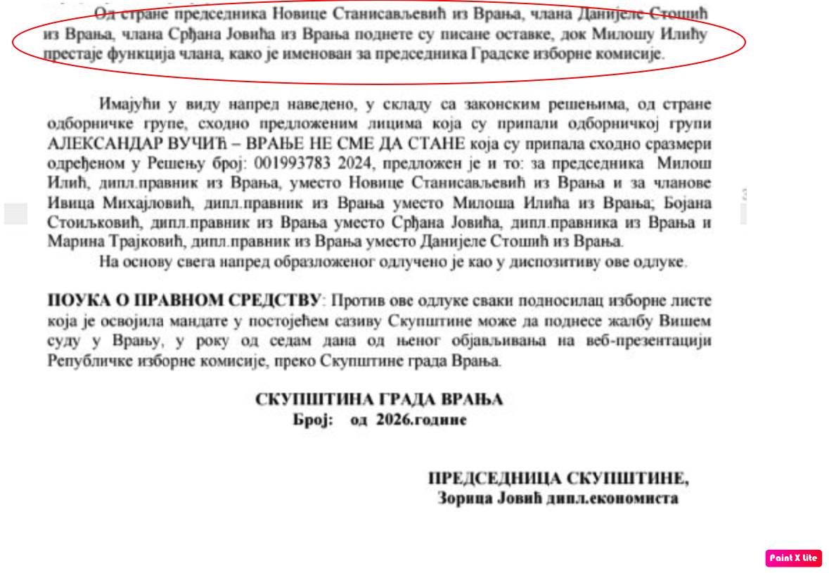 Četiri godine kasnije, u januaru 2026, u sklopu skupštinskog materijala za sednicu krajem tog meseca, odbornicima je, između ostalog, dostavljen predlog odluke o razrešenju predsednika GIK-a Stanisavljevića (zbog podnete ostavke) i tri člana te komisije (Miloša Ilića, zbog prestanka osnova po kome je imenovan, te Srđana Jovića i Danijele Tomić zbog podnetih ostavki).