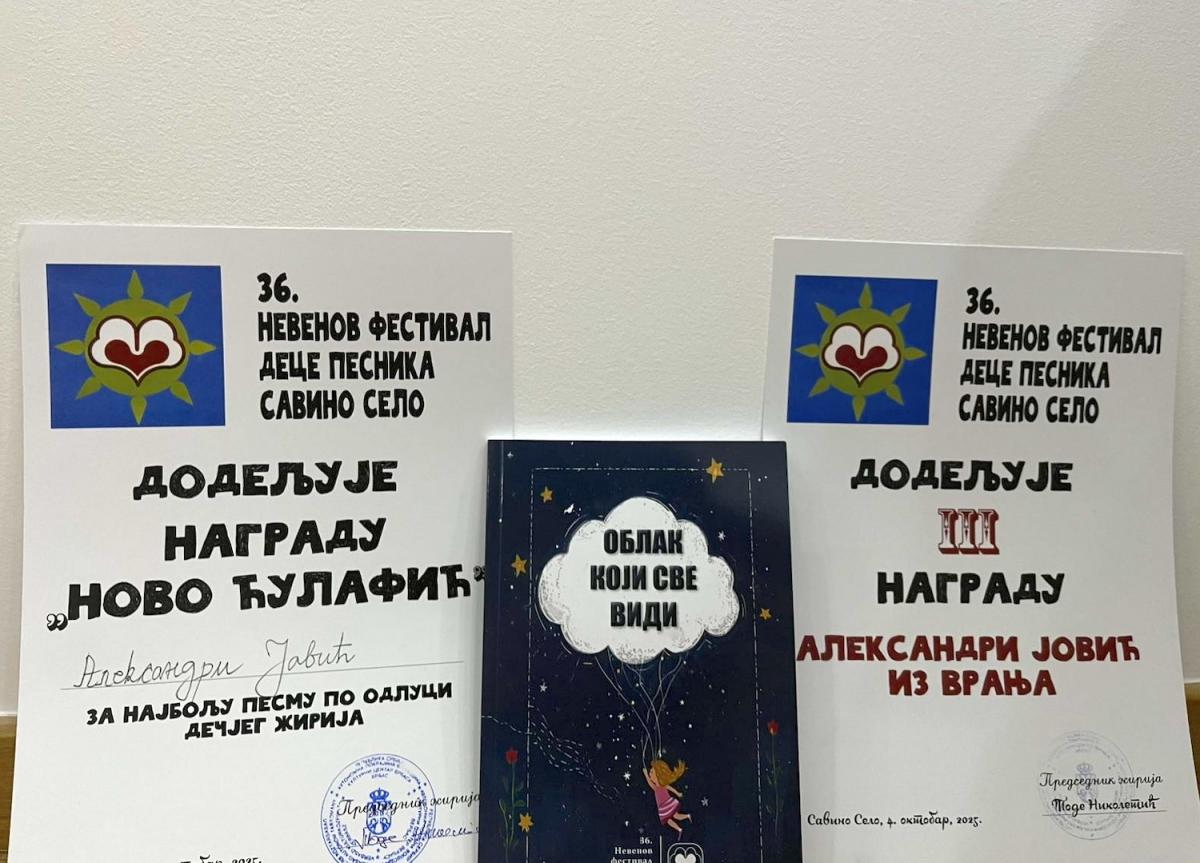 Čak tri nagrade osvojila je Aleksandra Jović, učenica Gimnazije Bora Stanković u Vranju, na Nevenovom festivalu dece pesnika, koji je održan u Savinom Selu kod Vrbasa.