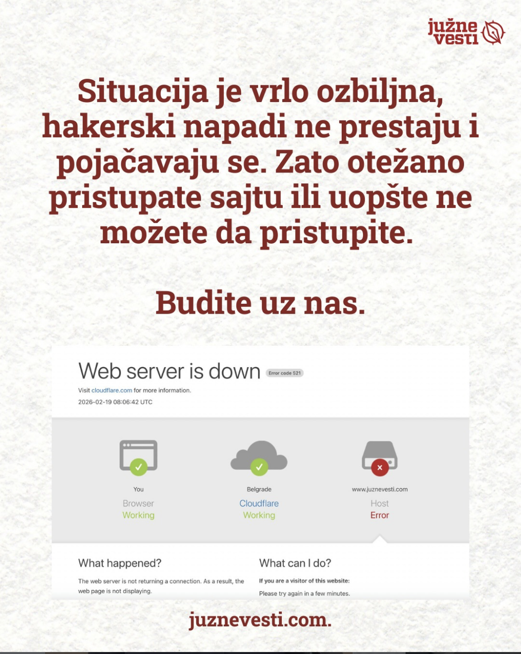 "Zato otežano pristupate sajtu ili uopšte ne možete da pristupite", navode iz Južnih vesti.