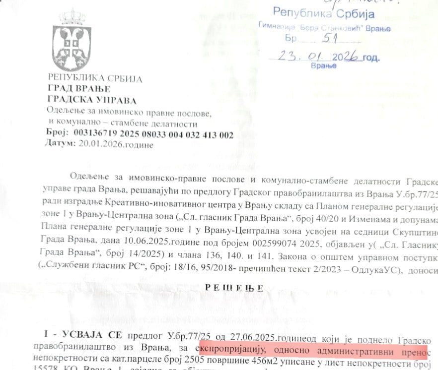 Naime, neko je (a ko bi nama to mogao biti?) naložio Gradskom pravobranilaštvu u Vranju da podnese predlog (br. 77/25 od 27. juna 2025) lokalnom Odeljenju za imovinsko-pravne poslove i komunalno-stambene delatnosti (na koje uticaj može imati jedino ko, možete sami da pogađate) "radi izgradnje Kreativno-inovacionog centra u Vranju”, na osnovu kojeg je to odeljenje 23. januara ove godine donelo rešenje kojim se usvaja predlog “za eksproprijaciju", odnosno “adminstraitvni prenos nepokretnosti sa katastarske parcele br. 2505… u korist Grada Vranja”. Uprkos tome što na objektu postoji legat, odnosno pravo korišćenja od strane Gimnazije Bora Stanković (ranije), a od februara ove godine imalac prava korišćenja je Zadužbina Olge i Nikole J. Dinića.