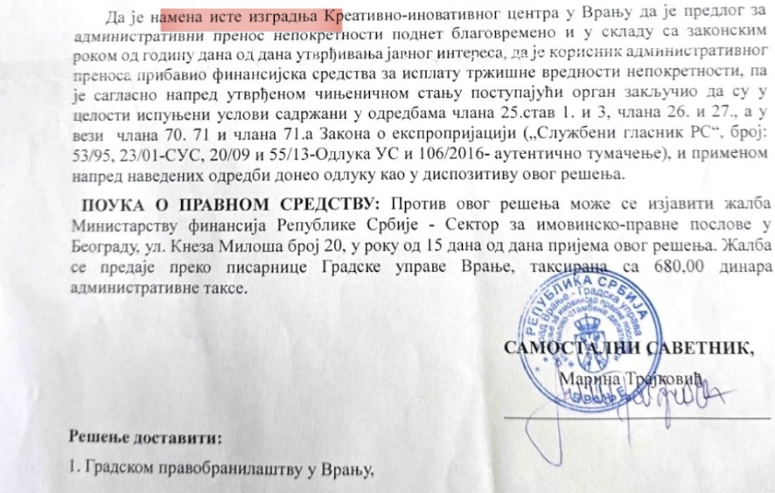 Po rešenju navedenog Odeljenja za imovinsko-pravne poslove (rukovodilac odeljenja je Sanja Zlatković) trebalo je sve navedeno od zemljišta i objekata da se “prenese u korist” Grada Vranja, lepo piše u rešenju, "radi izgradnje". Ne pominje se nikakva rekonstrukcija.