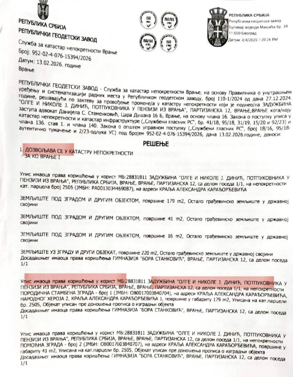 Međutim, dokumentacija Zadužbine Olge i Nikole J. Dinića, koja upravlja legatom i brine o njemu za račun i u interesu gimnazijalaca i najstarije srednje škole u Vranju, pokazuje da je Služba za katastar nepokretnosti Republičkog geodetskog zavoda 13. februara ove godine rešenjem dozvolila upis imaoca prava korišćenja navedene parcele, na kojoj se nalazi i napred navedeni objekti, u korist Zadužbine Olge i Nikole J. Dinića, potpukovnika u penziji. Tim dokumentom je Zadužbina postala imalac prava korišćenja umesto dotadašnjeg imaoca - Gimnazije Bora Stanković, po zahtevu o promeni imaoca prava od 30. januara 2026. godine.