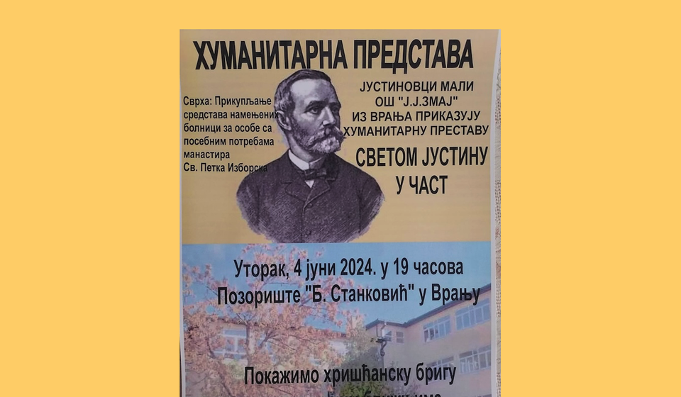 Učenici OŠ Jovan Jovanović Zmaj u Vranju pripremili su humanitarnu priredbu pod nazivim Svetom Justinu u čast, s ciljem prikupljanja pomoći za bolnicu Manastira Sv. Petke Izvorske.
