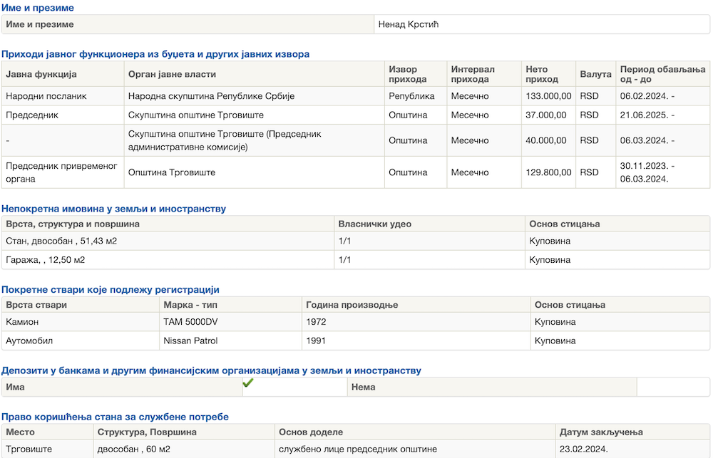 Osim toga, Nenad Krstić uživa i privilegiju korišćenja dvosobnog stana od 60 kvadrata u Trgovištu za službene potrebe, kao službeno lice, odnosno predsednik lokalnog parlamenta.