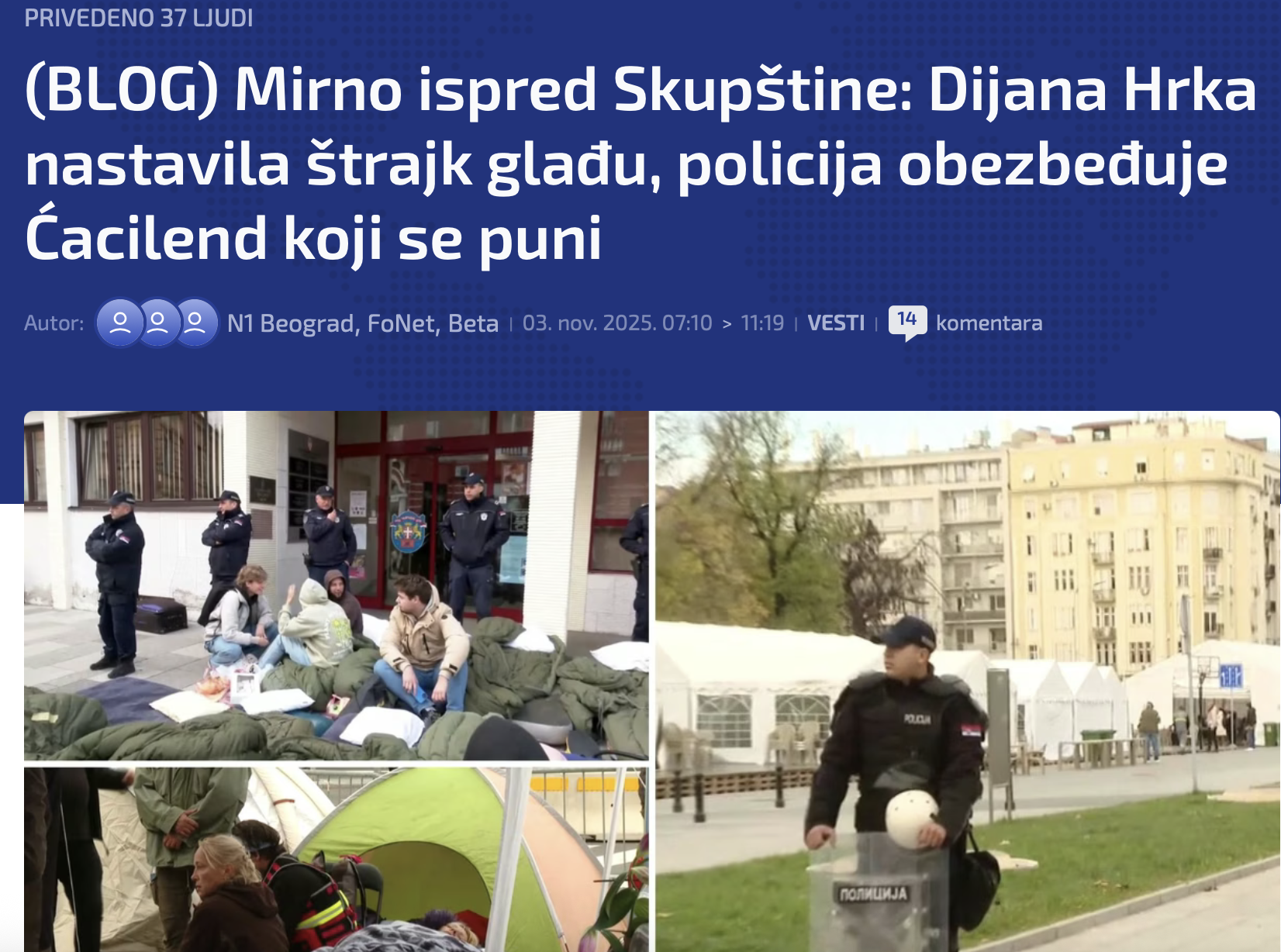 Dijana Hrka je u utorak ujutro nastavila štrajk glađu u Takovskoj ulici, desno od zgrade Parlamenta. Sa njom su zajedno građani koji joj pružaju podršku. Policija i dalje obezbeđuje Ćacilend. U odnosu na prethodnu noć, jutro je proteklo mirno.