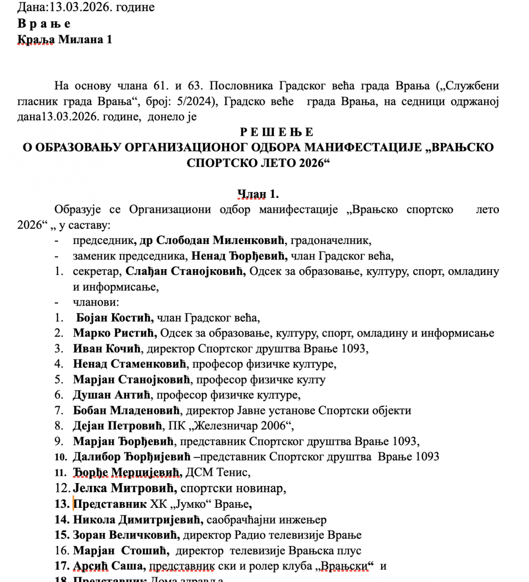 U vezi sa ovogodišnjim programom, dakle, donet je dokument pod nazivom "Rešenje o obrazovanju organizacionog odbora manifestacije Vranjsko sportsko leto 2026" sastavljen je od četiri "člana".