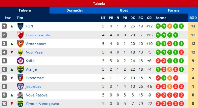Prvi je FON sa 13, Crvena zvezda uz utakmicu manje ima 12, a isti broj bodova kao i crveno-beli imaju niški Vinter sport, te Novi Pazar na četvrtom mestu.