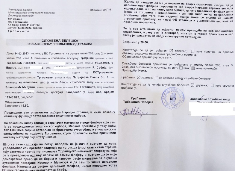 "Nakon naše stranačke akcije realizovane u ponedeljak, koja je podrazumevala podelu stranačkih flajera sa sadržajem spornog francusko-nemačkog sporazuma, o kome trenutno pregovara predsednik Srbije Aleksandar Vučić, pozvani smo u policiju na informativni razgovor, kako nam je rečeno po nalogu Osnovnog javnog tužilaštva u Vranju.