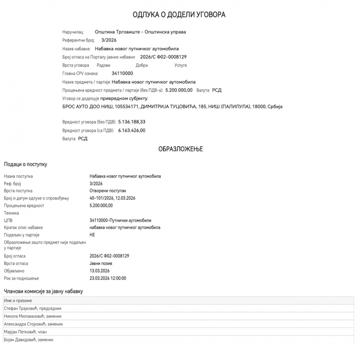 Dok se opština suočava sa brojnim infrastrukturnim i socijalnim problemima, Opštinska uprava Trgovište donela je Odluku o dodeli ugovora (broj 40-143/2026) za nabavku novog putničkog automobila.