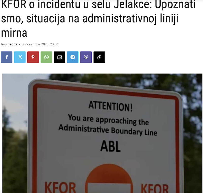 Međutim, večeras se za medije na albanskom oglasio KFOR, navodeći da su „svesni izveštaja“ o navodnom incidentu, ali da je bezbednosna situacija na administrativnoj liniji mirna.