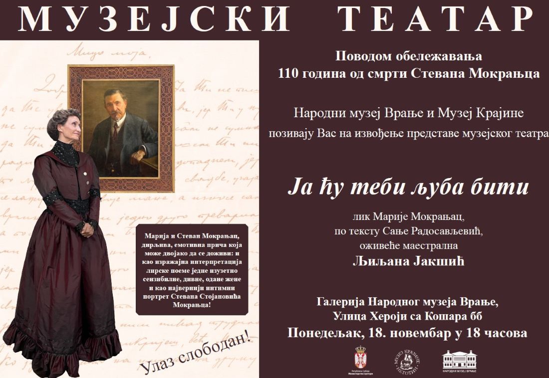 Predstava muzejskog teatra pod nazivom Ja ću tebi ljuba biti, povodom obeležavanja 110 godina od smrti Stevana Mokranjca, biće izvedena u Galeriji Narodnog muzeja, u ponedeljak 18. novembra.