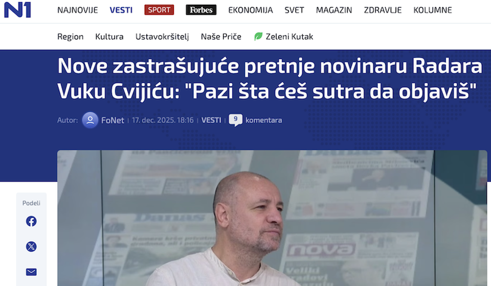 "Pozivamo institucije sistema da hitno utvrde identitet nasilnika koji se drznuo da direktno preti i zastrašuje našeg novinara. Podsećamo tužilaštvo da nijedan napad na Vuka Cvijića do sada nije rasvetljen, čak ni onaj koji su snimile nadzorne kamere. Mučko prskanje sprejom u oči novinaru na zadatku, napad policajca na njega ispred Pravnog fakulteta pred svedocima i danas su u fazi predistražnog postupka. Da li to znači da ova država u stvari ne želi da zaštiti novinare i tako faktički postaje saučesnik u njihovom ugrožavanju?", naveli su iz Radara.