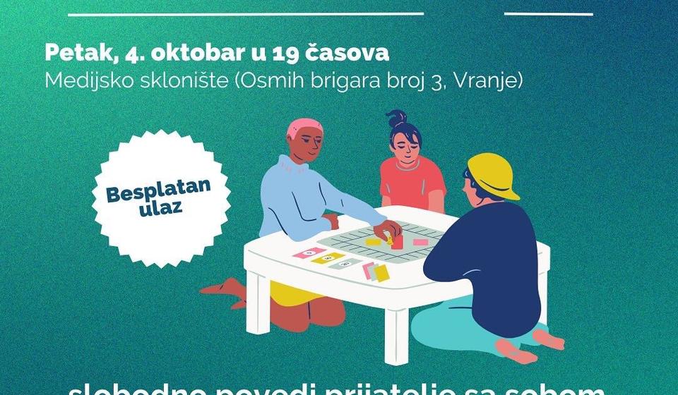 Udruženje mladih Naš svet, naša pravila iz Vranja, u okviru programa ,,Šta nam teško", organizovaće veče društvenih igara za mlade u prostorijama Medijskog skloništa (Osme brigade broj 3), u petak 4. oktobra u 19 časova.