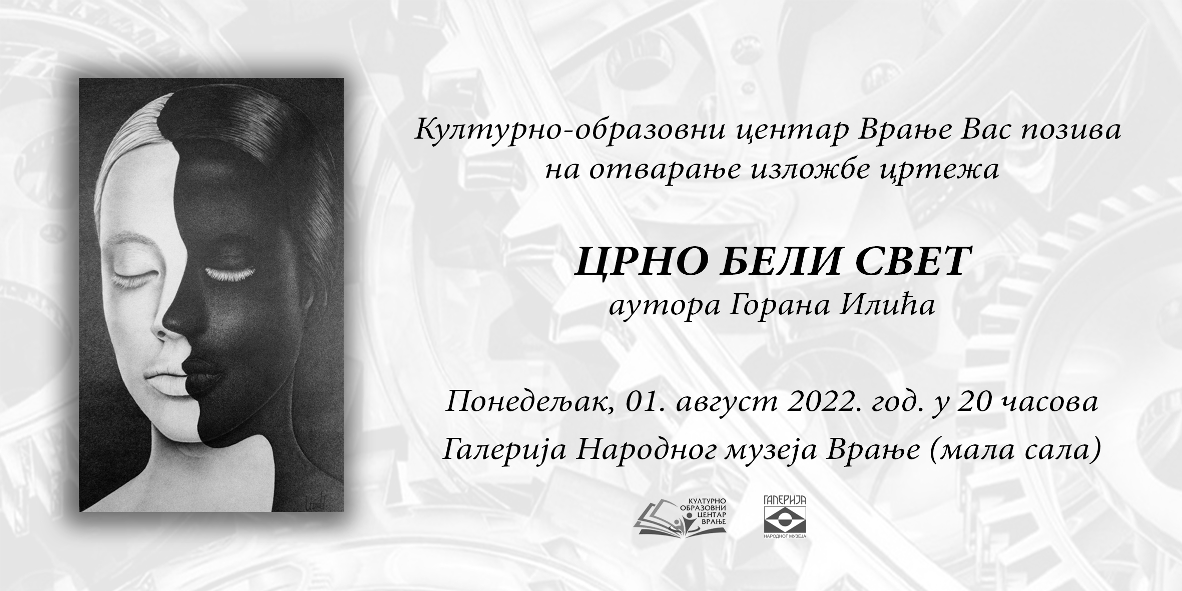 Izložba crteža Crno beli svet, umetnika Gorana Ilića iz Ćuprije, biće otvorena u ponedeljak 1. avgusta u 20 časova u maloj sali Galerije Narodnog muzeja u Vranju.
