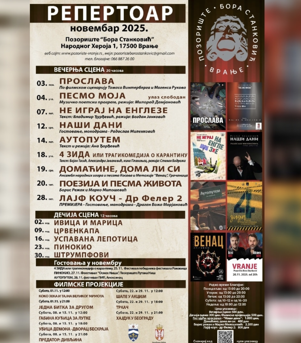 Na repertoaru Pozorišta Bora Stanković u Vranju pozorišnu i bioskopsku publiku u novembru očekuju pet dečjih i devet predstava na večernjoj sceni, te osam filmskih ostvarenja.