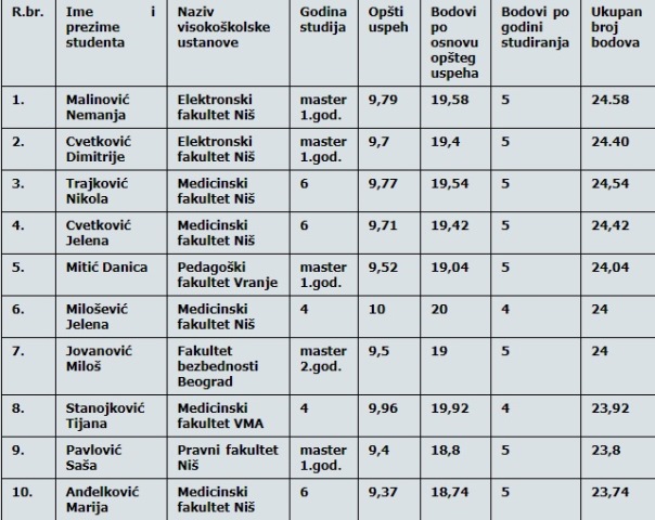Komisija za prijem, pregled i sastavljanje rang liste prispelih prijava učesnika konkursa za nagradu uspešnim studentima, imenovana od strane Gradskog veća grada Vranja, na osnovu Odluke o nagrađivanju učenika i studenata i novčanoj pomoći učenicima prvog razreda osnovnih škola na teritoriji grada Vranja („Službeni glasnik grada Vranja“, 27/2017), Pravilnika o uslovima, kriterijumima, načinu bodovanja i postupku za dodelu nagrada uspešnim studentima („Službeni glasnik grada Vranja“, broj: 30/2017) i Javnog poziva za dodelu nagrada uspešnim studentima na teritoriji grada Vranja, objavljenog na zvaničnom sajtu grada Vranja, 8. oktobra ove godine, sačinila je spisak koji možete pogledati OVDE.