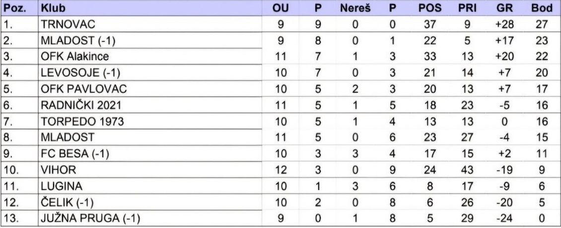 Posle nekompletnog 12. kola na tabeli Pčinjske okružne lige vodi tim Trnovca sa 27 bodova, druga je bosilegradska Mladost sa 23, a treće OFK Alakince sa 22.