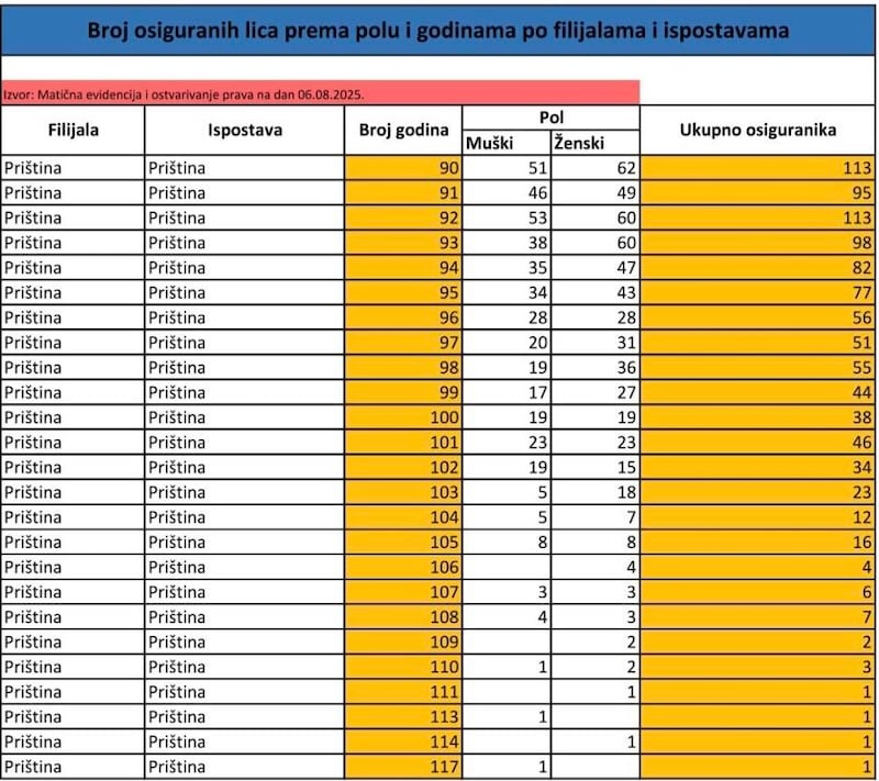 - Priština: 117 godina - jedno lice; od 100 do 117 godina ukupno 195 lica.