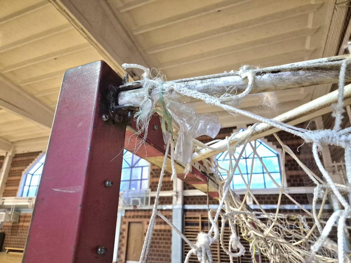 "Ta nadstrešnica se nalazi na ulazu u fiskulturnu salu, a ovako izgledaju golovi u toj fiskulturnoj sali, lepljivim trakama se učvršćuju prečke i stative, a kanapima krpe mreže.