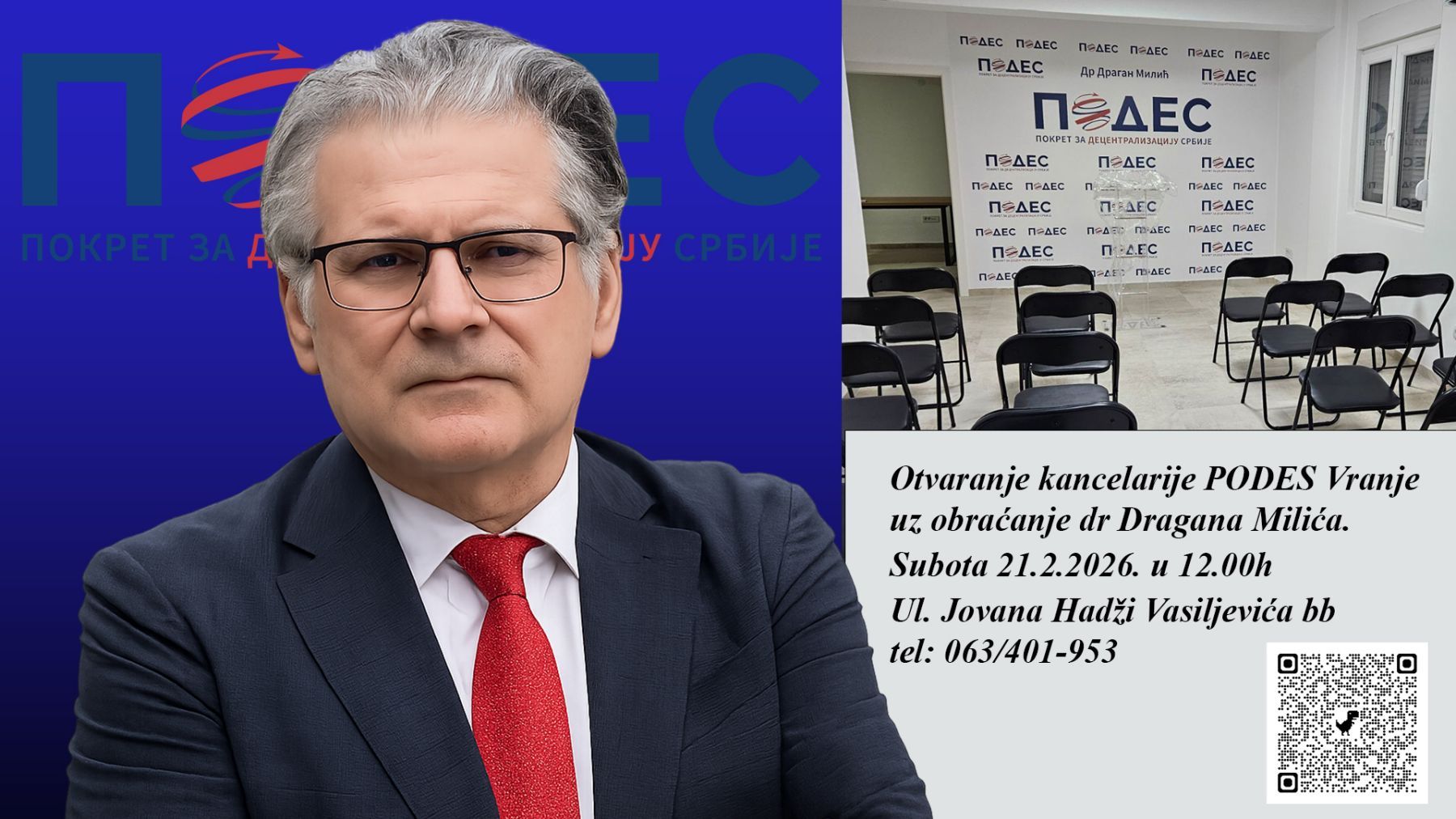 Otvaranje kancelarije Pokreta za decentralizaciju Srbije (Podes) i formiranje Okružnog odbora u Vranju zakazani su za subotu 21. februar u 12 časova.