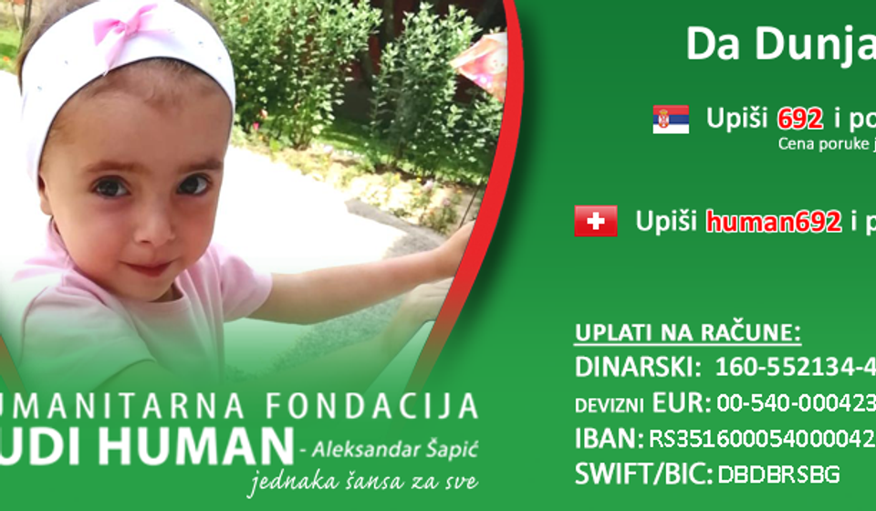 Humanitarna fondacija BUDI HUMAN – Aleksandar Šapić prikuplja novčana sredstva za Dunju, a portal Vranje News poziva sve ljude dobre volje da zajedno pomognemo ovoj devojčici.