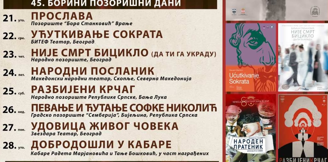 "Selekcioni ciklus za 45. Borine pozorišne dane obuhvatio je gledanje četrdesetak predstava iz celog regiona. Bez unapred definisanog koncepta, ipak sam pokušao da u prethodnih nekoliko meseci sagledam pozorišnu produkciju koja se temeljila na umetnički vrednim, književno - dramaturški relevantnim delima. Ovo opredeljenje zasnovano je, s jedne strane, na uverenju da je primarni preduslov za odličnu predstavu kvalitetan tekstualni predložak, bez obzira da li je reč o originalnoj drami, dramatizaciji proze, ili autorskom projektu, a s druge, činjenica da ovaj renomirani festival čuva sećanje na velikog srpskog književnika prefinjenog literaranog stila i impozantnog stvaralačkog opusa. Ono što je primetno u većini tih ostvarenja jeste da su ona u dinamičnom dijalogu sa stvarnošću i aktuelnim društvenim okolnostima, pri čemu vešto izbegavaju banalnu dnevnu politizaciju. Retki su kreativni izleti u svojevrsnu formu eskapizma, a na sreću, gotovo da nisam video predstave čija je jedina svrha besmislena zabava i podilaženje ukusu manje zahtevne publike. Vrhunski teatar je oduvek bio mesto kritičkog sagledavanja vremena i prostora u kojima svi zajedno egzistiramo, ističući univerzalne pojave i fenomene celokupne ljudske civilizacije, hrabro progovarajući o problemima društvenih uređenja, duhovnoj sferi života, političkoideološkim zabludama i manipulacijama, etičkim normama, sudbini pojedinaca i psihološko-emotivnim karakterima junaka čije priče na sceni oživljava. Nadam se da će idejno-tematska, žanrovska i stilska heterogenost izabranih predstava pružiti priliku publici da se iskreno suoči sa takvim bogatstvom raznolikosti".