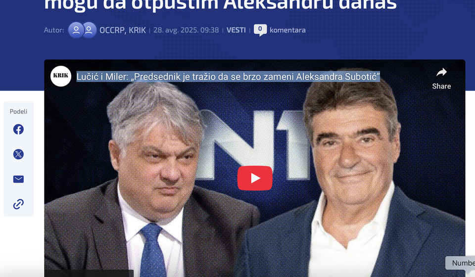 Subotić je godinama branila uređivačku nezavisnost uprkos političkim pritiscima, koji su se pojačali tokom proteklih devet meseci protesta protiv korupcije i autoritarizma vlasti. Nekoliko provladinih medija krenulo je u ofanzivu povodom teksta koji su juče objavili OCCRP i KRIK, tvrdeći da je izveštavanje lažno. Međutim, audio snimak potvrđuje druge dokaze da su direktori razgovarali o smeni Subotić, kako tokom tog razgovora, tako i na ranijem ličnom sastanku u glavnom gradu Srbije, Beogradu
