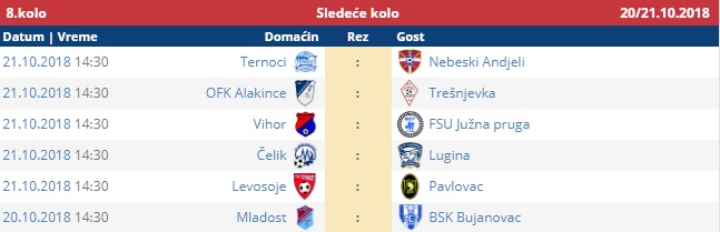 Na četvrtom mestu sada je ekipa Ternoci iz Velikog Trnovca sa 14 bodova (u ovom kolu remizirali na gostovanju u Suvojnici protiv Mladosti 2:2), koliko ima i Čelik iz Belog Polja na petoj poziciji (odigrao bez golova na vrućem terenu u Pavlovcu).