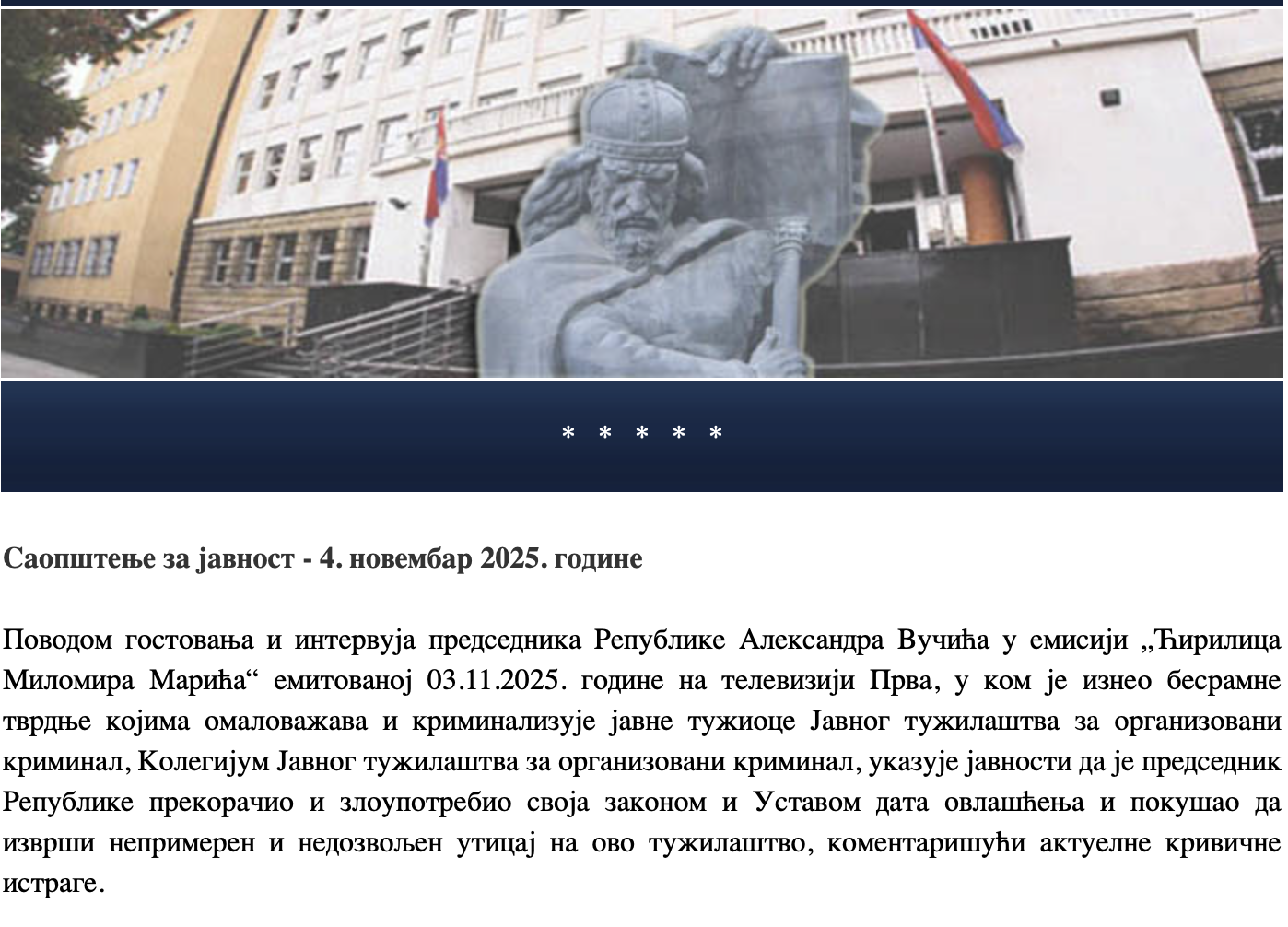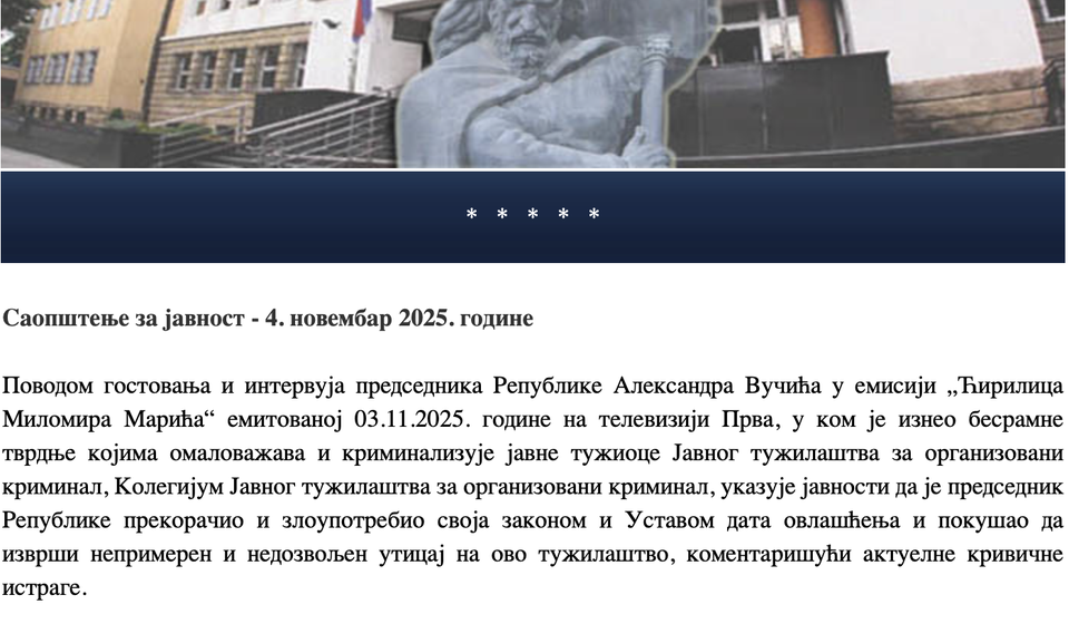 Vranje/Beograd - Povodom gostovanja i intervuja predsednika Srbije Aleksandra Vučića u emisiji Ćirilica Milomira Marića, emitovanoj u ponedeljak na jednoj televiziji sa nacionalnom frekvencijom, u kom je izneo besramne tvrdnje kojima omalovažava i kriminalizuje javne tužioce Javnog tužilaštva za organizovani kriminal, Kolegijum tog tužilaštva ukazao je javnosti da je Vučič prekoračio i zloupotrebio svoja zakonom i Ustavom data ovlašćenja i pokušao da izvrši neprimeren i nedozvoljen uticaj na ovo tužilaštvo, komentarišući aktuelne krivične istrage, saopštili su.