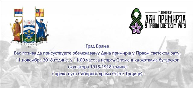 U nedelju 11. novembra, ispred Spomenika žrtvama bugarskog okupatora 1915 – 1918. godine, u Vranju će biti obeležen Dan primirja u Prvom svetskom ratu.