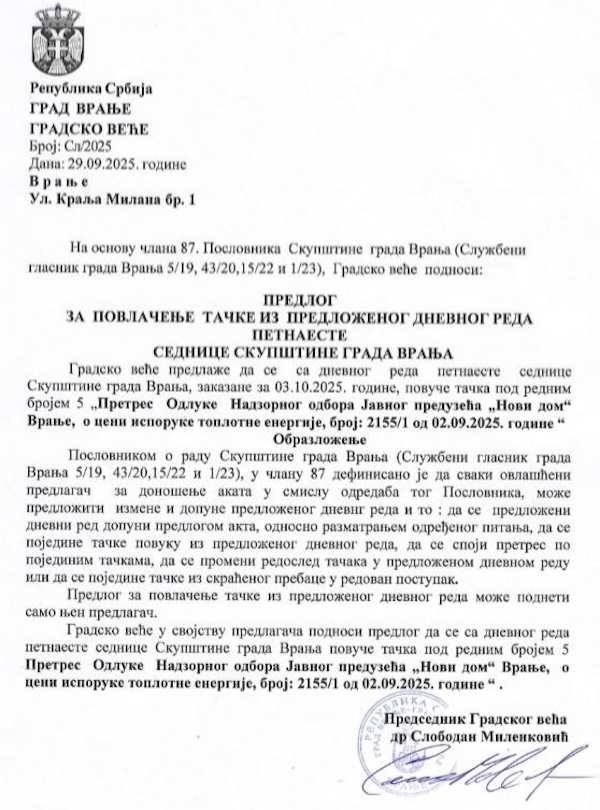 Uoči skupštinske sednice zakazane za petak 3. oktobar, vlast u Vranju predložila je da se sa dnevnog reda povuče tačka pod rednim brojem 5, u okviru koje je trebalo da se vodi rasprava o poskupljenju grejanja u Vranju za 20 odsto.