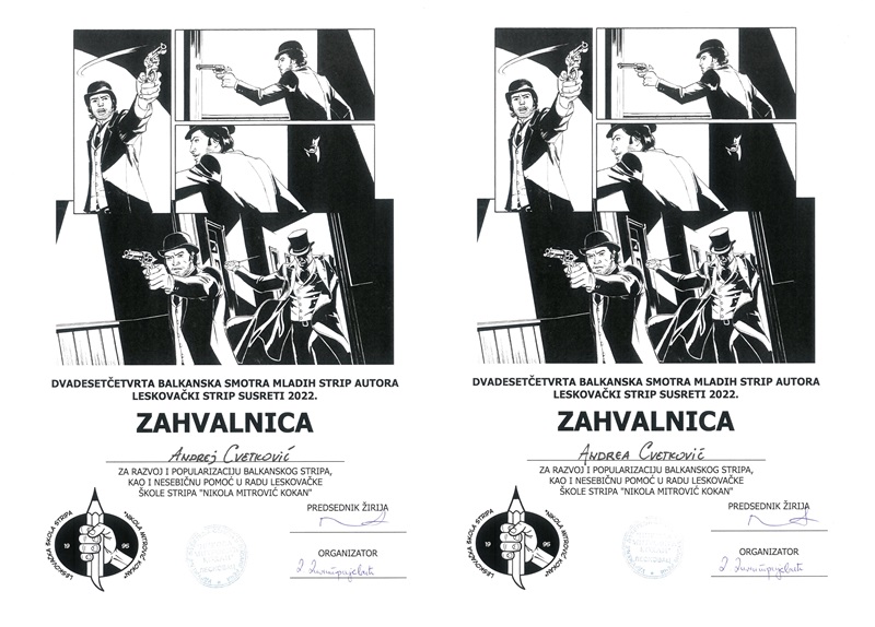 Desetoro učenika vranjske OŠ Svetozar Marković u Vranju i njihov mentor - učitelj Miomir MiDej Dejanović dobili su zahvalnice za razvoj i popularizaciju balkanskog stripa na 24. Balkanskoj smotri strip-autora.