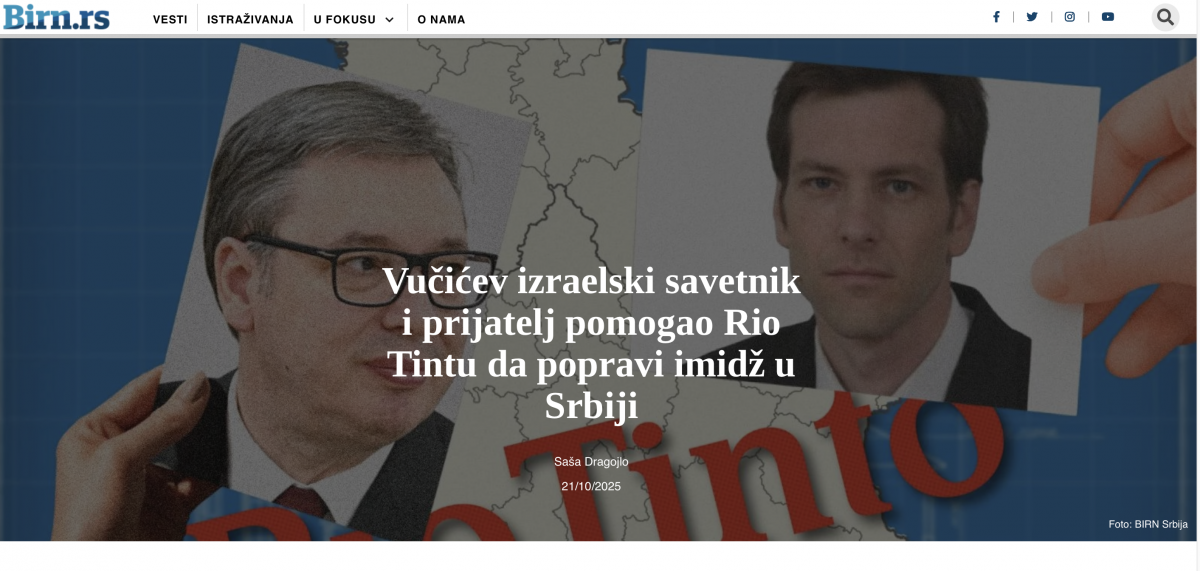 Asaf Eisin, izraelski politički propagandista koji sa Aleksandrom Vučićem sarađuje više od dve decenije i kog Vučić naziva „prijateljem“, radio je na strateškoj medijskoj kampanji za Rio Tinto u jeku najvećih protesta protiv projekta Jadar 2021. godine, uprkos tome što je interni izveštaj kompanije kao potencijalni problem za angažovanje Izraelca naveo upravo njegovu bliskost sa Vučićem, otkriva BIRN.