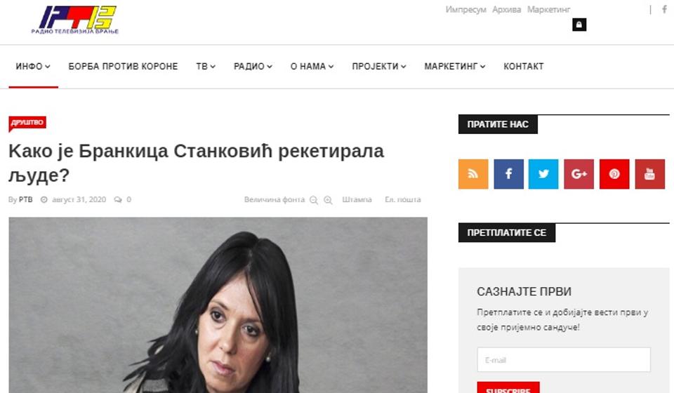 Osim RT Vranje tekst portala prismotra.net o Brankici Stanković preneli su RTV Pančevo i Dunav TV u vlasništvu Radoice Milosavljevića, užički portal Infopress čiji je izdavač preduzeće Konzum Lav, u vlasništvu firme registrovane u SAD.