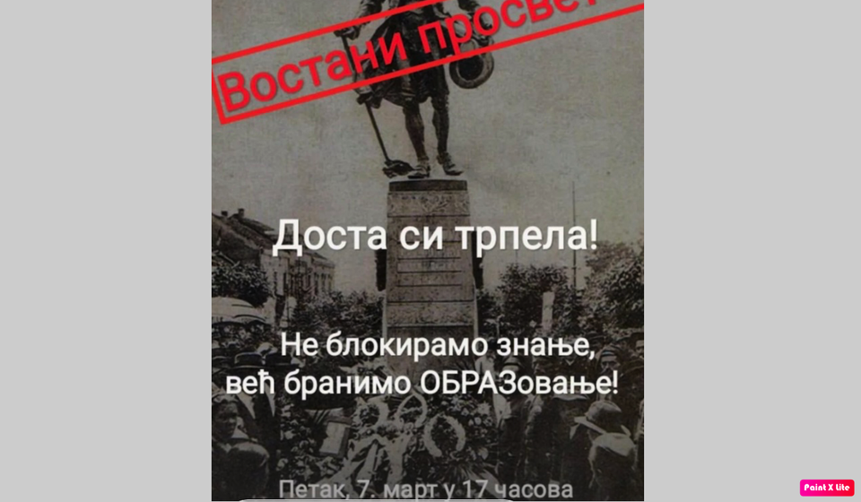 Protest u odbranu obrazovanja pod parolom Vostani prosveto - dosta si trpela, održaće se u petak 7. marta a početkom u 17 časova kod Gimnazije Bora Stanković u Vranju.